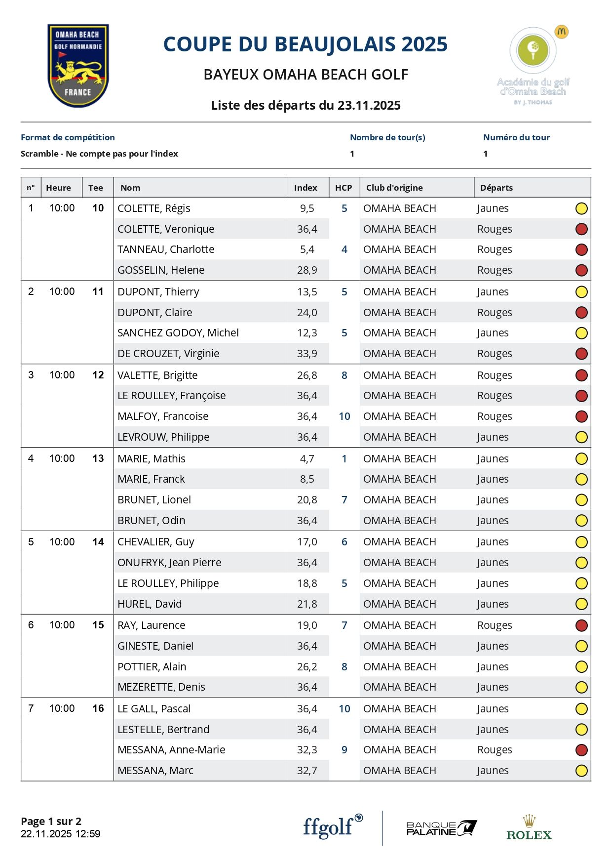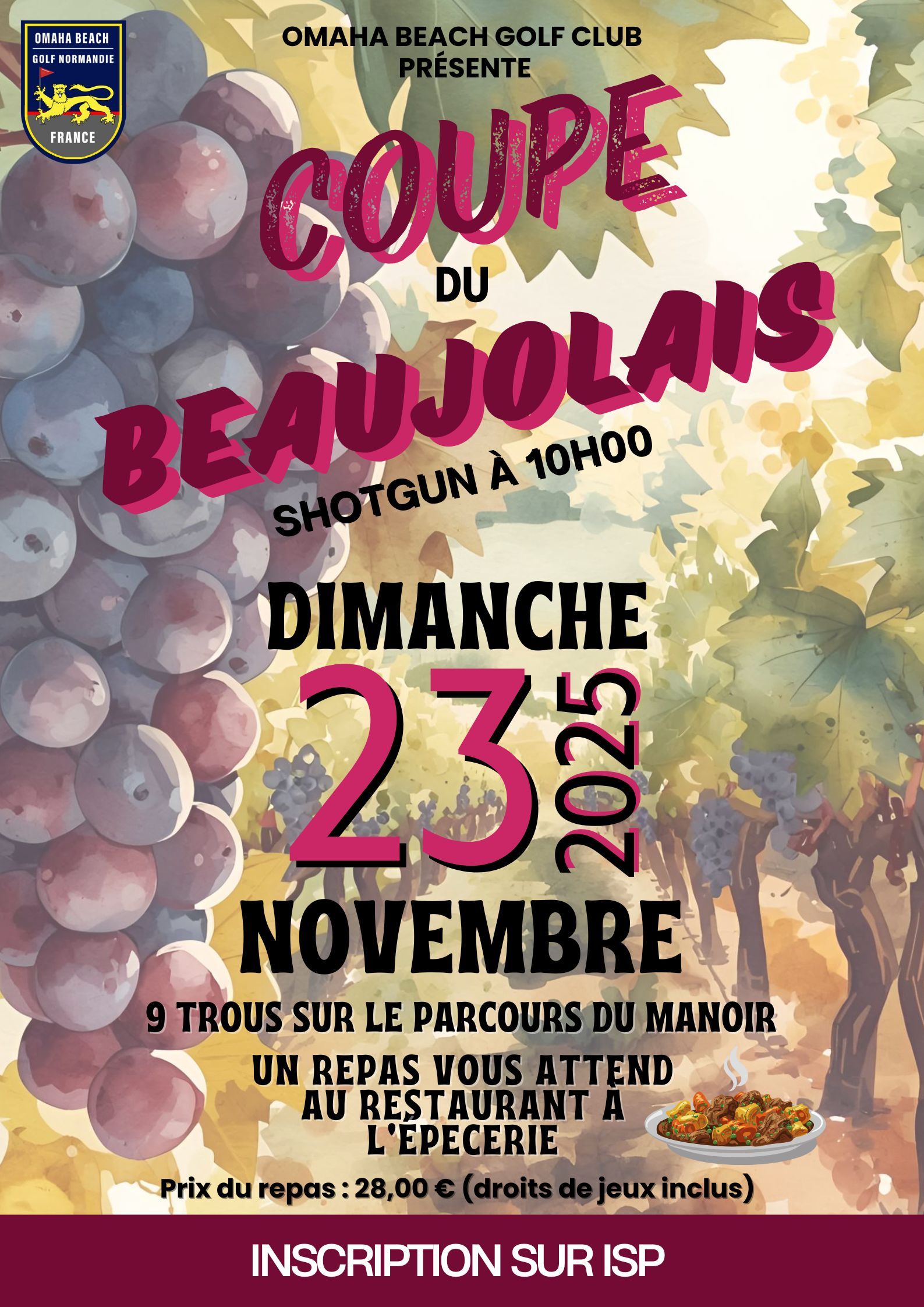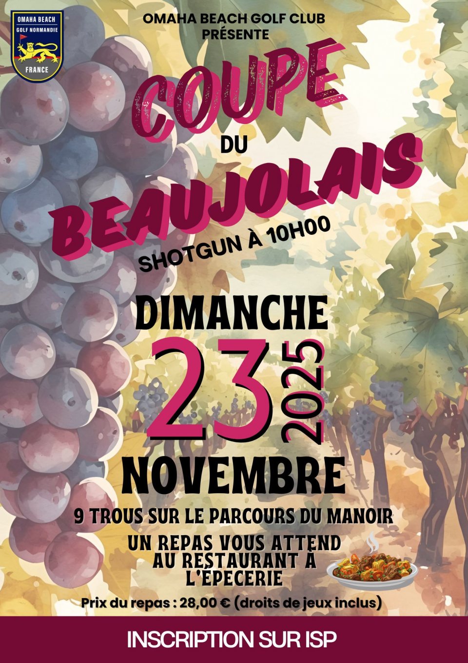 Liste des actualités Publié le 22 novembre 2025 Coupe du Beaujolais 2025 Liste des départs de la Coupe du Beaujolais 2025 Voici la liste des départs de la Coupe du Beaujolais qui se déroule ce Dimanche 23 Novembre 2025 sur le parcours du Manoir. À la suite de la compétition, un repas vous attendra au Restaurant à l'épicerie ! Bonne chance à toutes et tous !