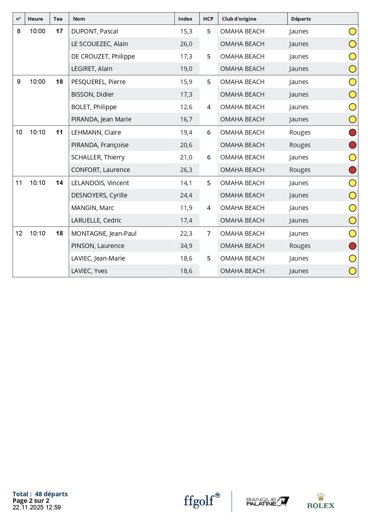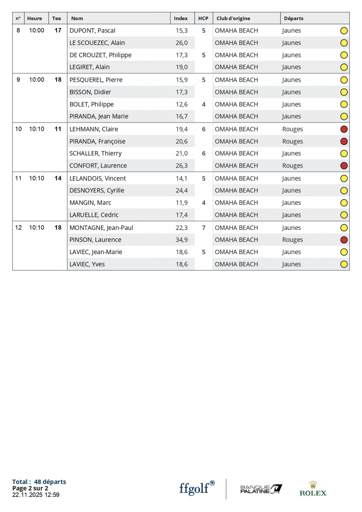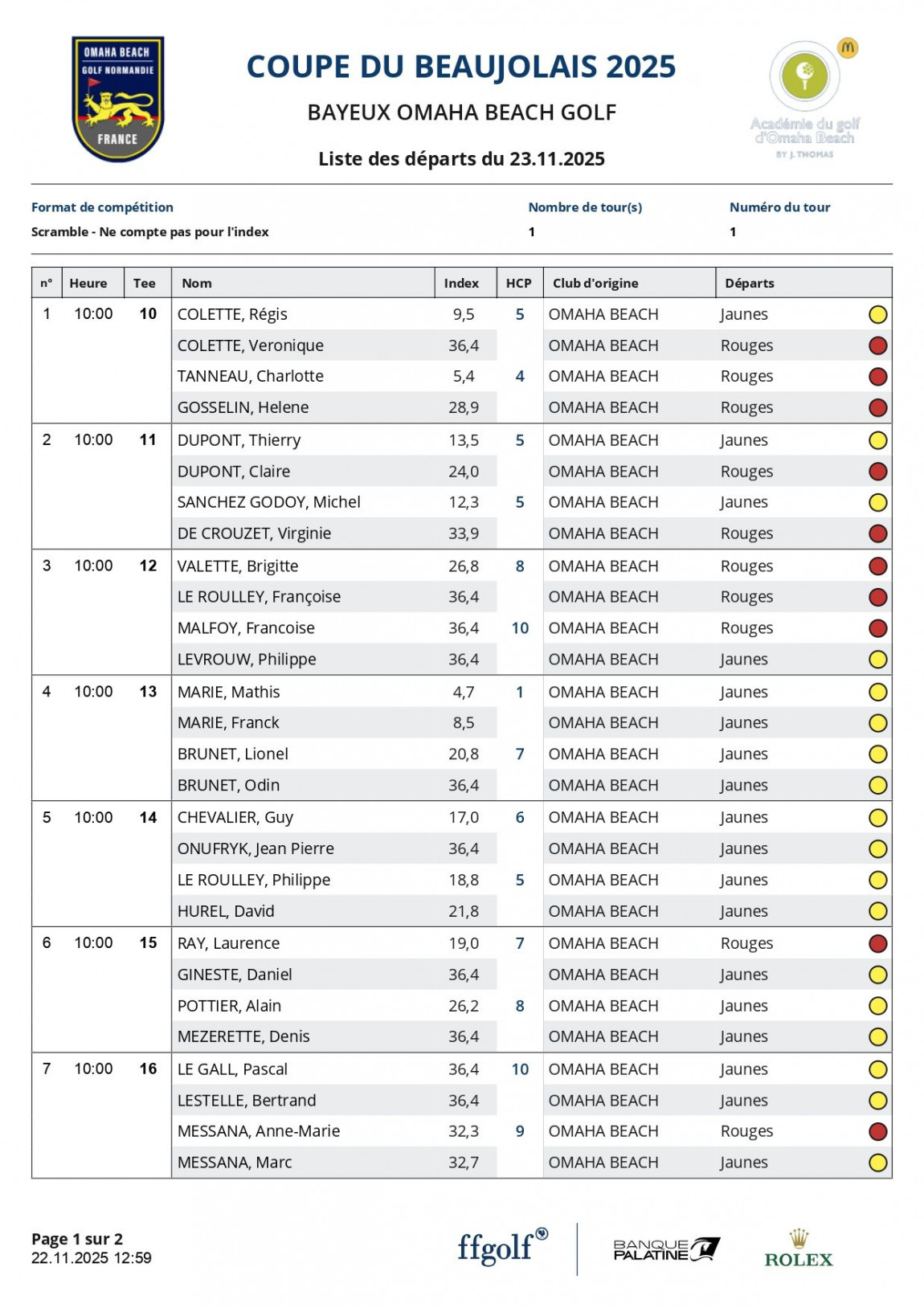 Liste des actualités Publié le 22 novembre 2025 Coupe du Beaujolais 2025 Liste des départs de la Coupe du Beaujolais 2025 Voici la liste des départs de la Coupe du Beaujolais qui se déroule ce Dimanche 23 Novembre 2025 sur le parcours du Manoir. À la suite de la compétition, un repas vous attendra au Restaurant à l'épicerie ! Bonne chance à toutes et tous !